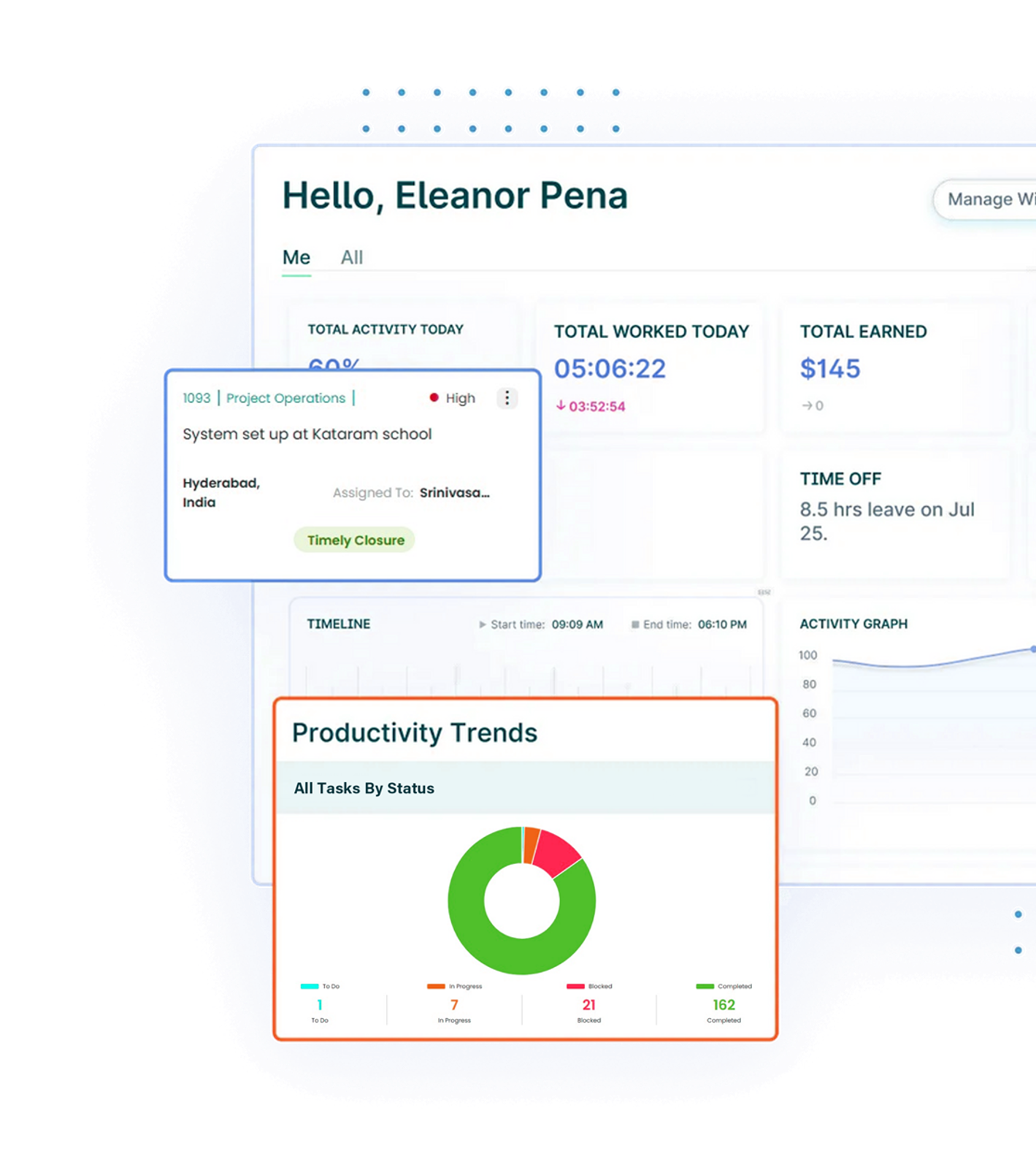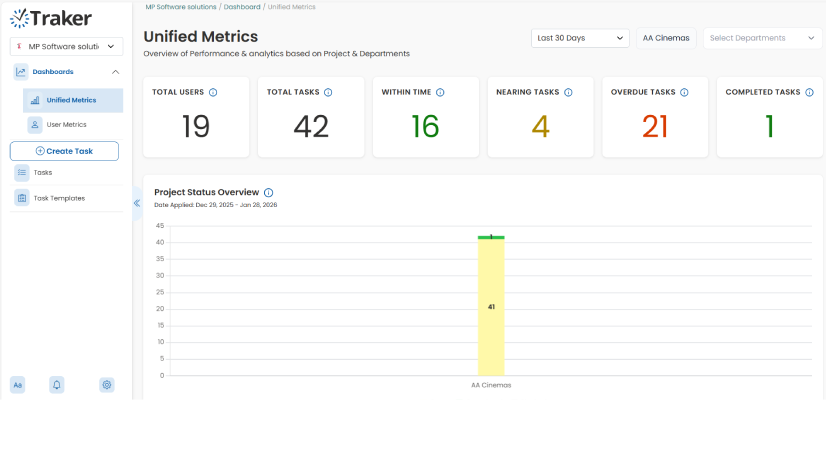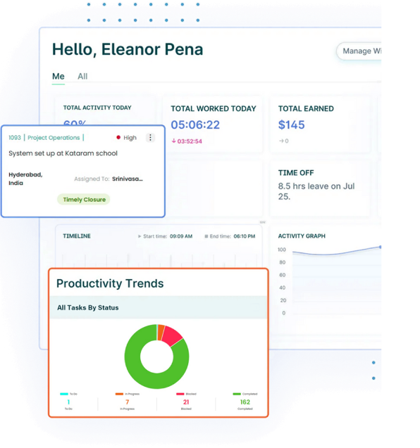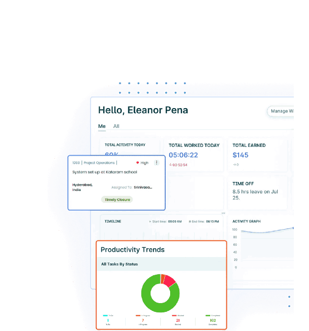 Keep everything under one roof. From projects to daily tasks to team schedules — Traker’s unified dashboard brings it all together in one simple view. No clutter, no confusion. Just a single source of truth for your team’s work. Stay on top of progress without wasting time switching between apps.